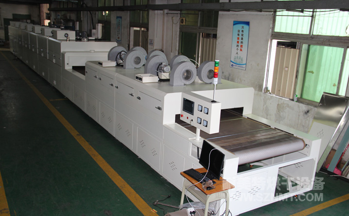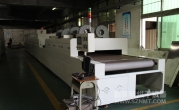 2、外形尺寸(約):總長24500mm*總高1740mm*總寬1890mm,地面到網(wǎng)帶的高度為950-1050mm,爐體內(nèi)進料高度為150mm;烘干部分總長14000mm,分7段獨立控溫(每段4個測溫?zé)犭娕迹?,每?000mm。冷卻段長4000mm,UV區(qū)2000mm,前后緩沖區(qū)各長500mm,進料部分長2000mm,出料部分長1500mm, 爐體前后大梁上方裝有急停開關(guān),共4個。